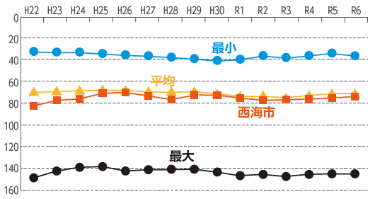 市税などの経常的な収入が義務的な経費に使われる割合の数値です。数値が低いほど様々な政策に柔軟に対応できることを表します。西海市は県内13市の平均より低いものの、上昇傾向にあり、財政の硬直化が懸念されます。