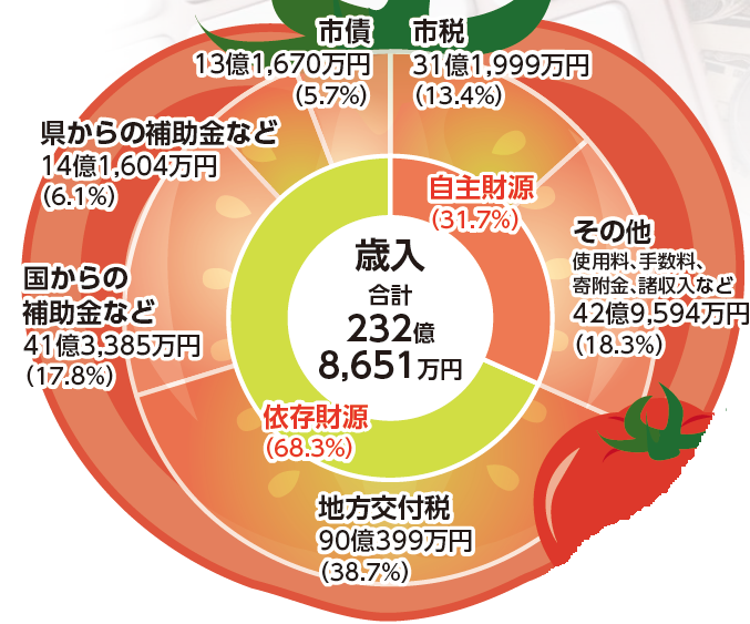 ・依存財源…地方交付税や国・県支出金など、国や県から入ってくるお金や、市債(借金)などです。