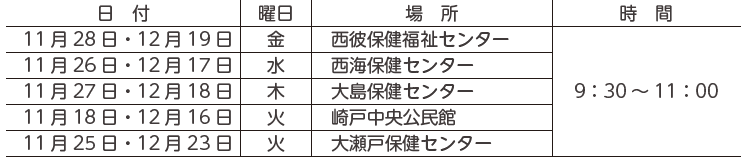 基本的に予約制としていますので、健康ほけん課までご連絡ください。