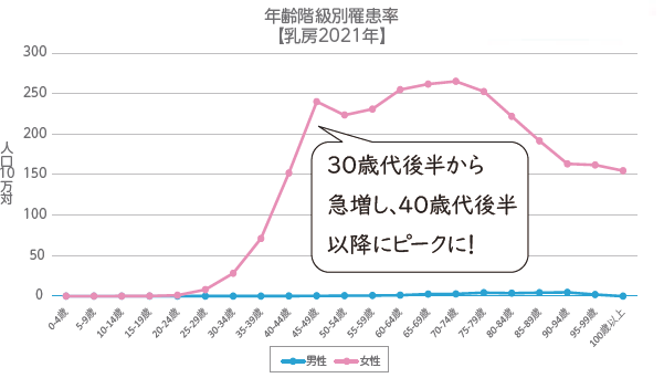 年間約10万人が新たに乳がんと診断されており、女性のかかるがんで第1位となっています。