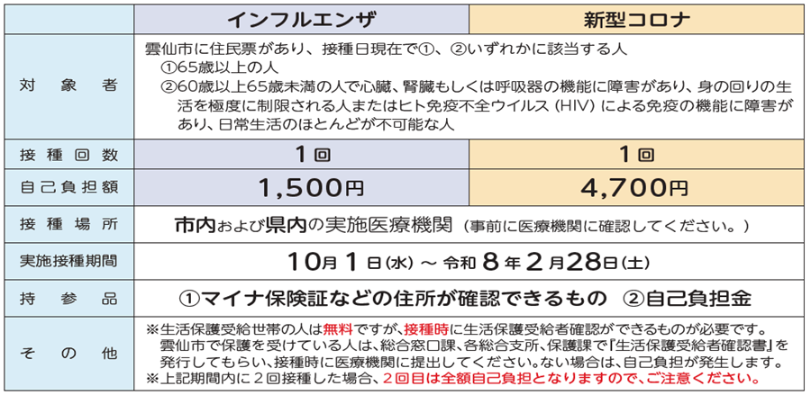 ◎接種費用の対象者、自己負担額などは以下のとおりです。