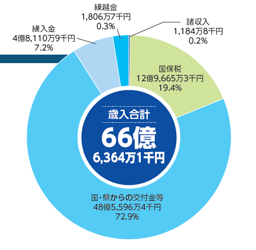 7割以上を県からの交付金や一般会計繰入金などが占め、残りを皆さまからの国保税で賄っています。