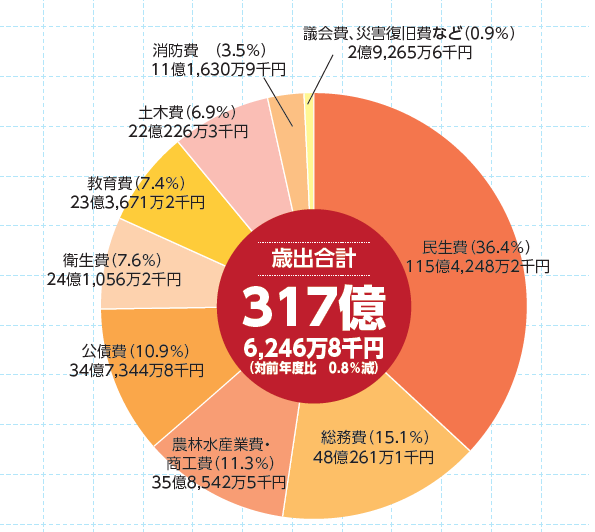 一般会計における歳出決算額は、317億6,246万8千円です。令和5年度の決算額と比較すると、商工費や公債費の減などにより、全体で2億6,975万9千円(0.8%)の減となっています。