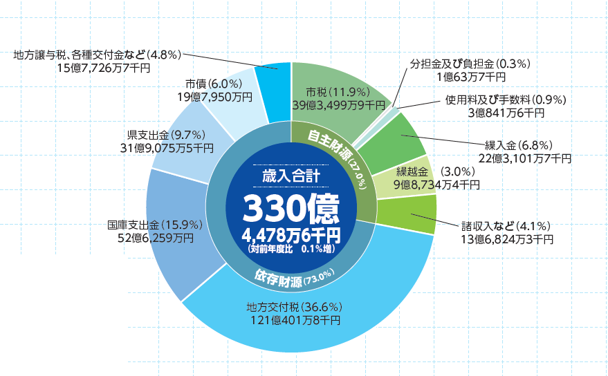 一般会計における歳入決算額は、330億4,478万6千円です。令和5年度の決算額と比較すると、地方交付税や繰入金の増などにより、全体で2,521万5千円(0.1%)の増となっています。