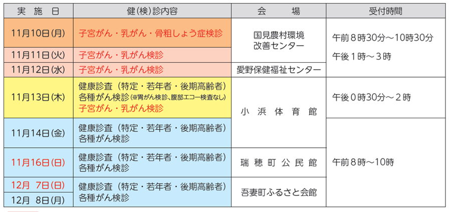 ・骨粗しょう症検診…40歳~70歳までの女性(集団健診のみ)※橙色の実施日に受診できます。