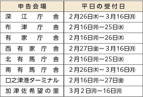 ※申告期間中、担当職員は全員申告会場に出向きますので、税務課・各支所での申告相談は行いません。