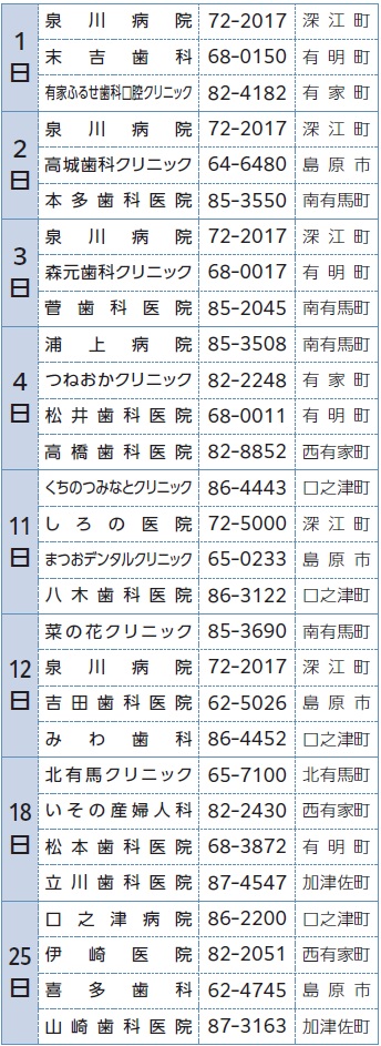 くらし 休日在宅当番(歯科)医 41/42 前の記事 次の記事 発行日 : 2026年01月01日 自治体名 : 長崎県南島原市 広報紙名 : 広報南島原 令和8年1月号 当番医/診療時間:午前9時~午後5時 当番歯科/診療時間:午前9時~正午 ※変更になる場合がありますので、必ずお電話でご確認ください。 ■令和8年1月 Tweet シェアする 1月市民カレンダー その他のお知らせ(広報南島原 令和8年1月号)
