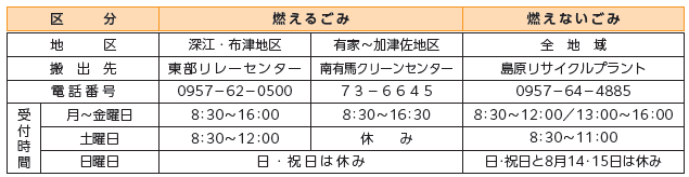 ・下記施設に直接搬入するか、定期の収集日に指定の袋で排出してください。