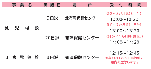 ※対象年齢などは別途配布している「母子保健事業のお知らせ」をご覧ください。