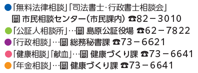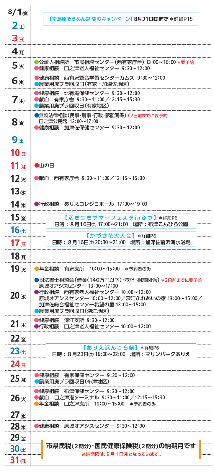 くらし 8月 市民カレンダー 52/55 前の記事 次の記事 発行日 : 2025年08月01日 自治体名 : 長崎県南島原市 広報紙名 : 広報南島原 令和7年8月号 Tweet シェアする 親子ふれあいプログラム 「にほ・さんぽ」 休日在宅当番(歯科)医