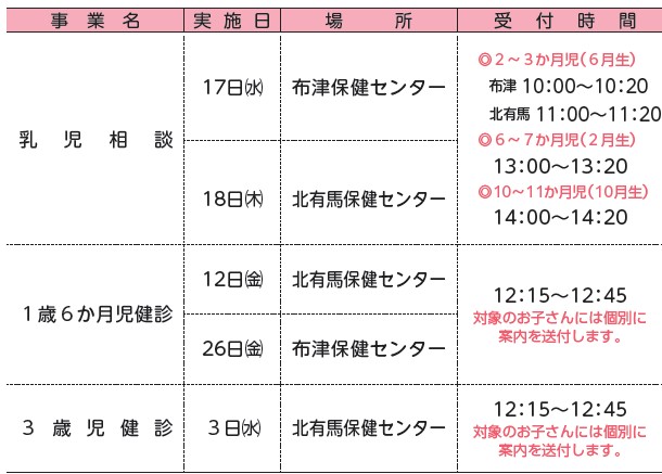 ※対象年齢などは別途配布している「母子保健事業のお知らせ」をご覧ください。