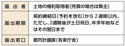 一定面積以上の土地について売買などの取引をした場合には、国土利用計画法により、土地の権利取得者は、契約締結の日から2週間以内に土地の利用目的などについて土地の所在する市町へ届出が必要です。