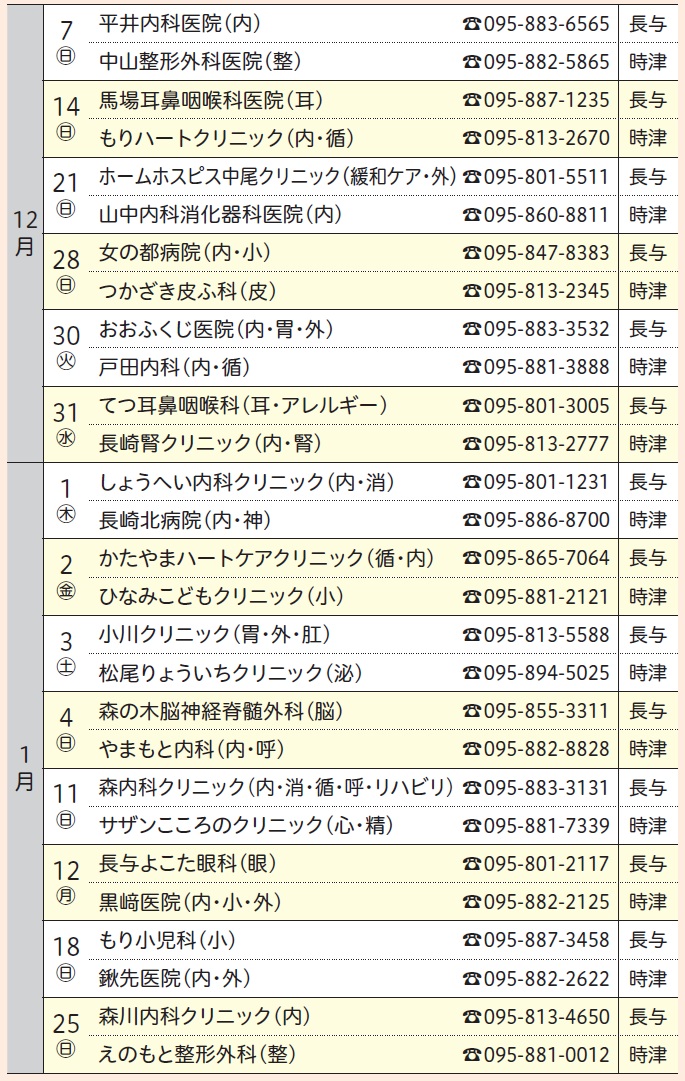 (注)専門外に関しては診療ができない場合があります。当番医は変更することがありますので、当日の新聞や直接医療機関で確認してください。