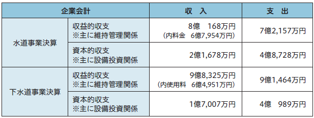 水道事業、下水道事業ともに経営成績は黒字決算となり、財政状態においては資金不足も発生せず健全経営を維持しています。