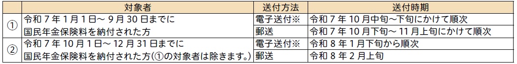 日本年金機構から、下記のスケジュールで「社会保険料(国民年金保険料)控除証明書」が発送されますので、年末調整や確定申告の際に使用してください。