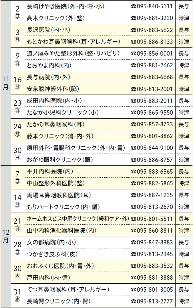 (注)専門外に関しては診療ができない場合があります。当番医は変更することがありますので、当日の新聞や直接医療機関で確認してください。