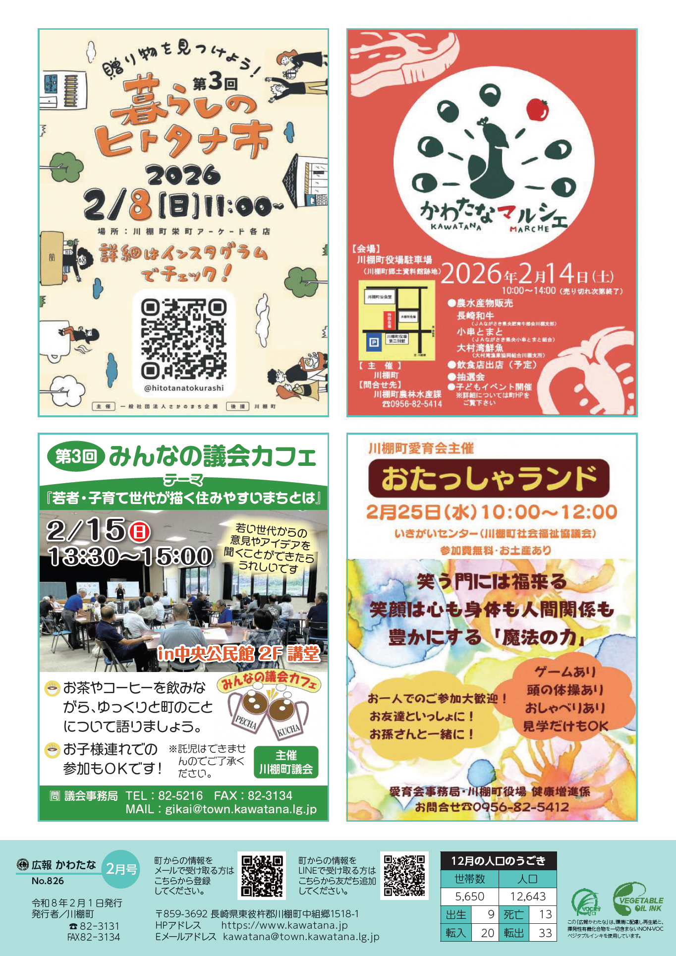 くらし 広報かわたな 令和8年2月号 裏表紙 17/17 前の記事 発行日 : 2026年02月01日 自治体名 : 長崎県川棚町 広報紙名 : 広報かわたな 令和8年2月号 Tweet シェアする 広報かわたな 令和8年2月号 P.18
