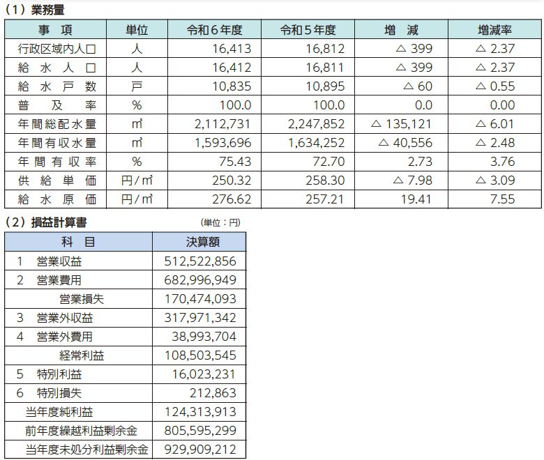 令和3年4月より水道料金が実質改定後料金となったことにより、『営業収益(給水収益)』が料金改定前に比べ増加したことと、令和3年度より元利償還金に対する一般会計補助金を収益として『特別利益』に計上したことが黒字の大きな要因となりました。
