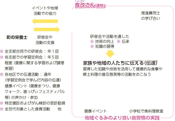 「私達の健康は私達の手で~延ばそう健康寿命つなごう郷土の食~」をスローガンに、食を通した地域の健康づくりを推進する、全国に協議会組織をもつボランティア団体です。「食改(しょっかい)さん」や「ヘルスメイト」等と呼ばれ、ピンクのTシャツやエプロンを着用して活動しています。バランスのとれた食生活について学んだことを、実践し家族やお隣さん、お向いさんへと働きかけ、仲間とのふれ合いを通じて、地域のよりよい食習慣づくりを進めています。
