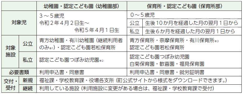 保育所・認定こども園(保育所部)は申込要件により必要書類が異なりますので、町公式サイト等から「保育所等の利用のしおり」をご覧になり、該当する書類の提出をお願いします。