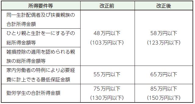 各種扶養控除等の適用を受けるための所得要件額が10万円引き上げられます。