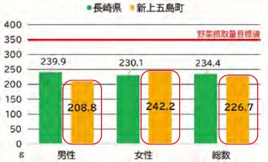 野菜を摂取することは、生活習慣病予防につながります。しかし本町の野菜摂取量は、1日の目標量の350gに対し、226.7gで100g以上少なく、長崎県の平均よりも少ない結果になっています(図-1参照)。