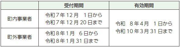 令和8・9年度を有効期間とした建設関連業務・物品調達・役務の提供に係る入札参加資格の申請受付期間は下表のとおりです。