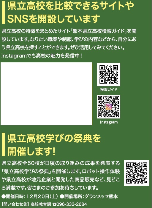 子育て キラリ輝き 夢に挑戦 県立高校で夢を叶える第一歩を! 2/7 前の記事 次の記事 記事を読み上げる 発行日 : 2025年12月18日 自治体名 : 熊本県 広報紙名 : 熊本県広報紙「県からのたより」 令和7年冬号 Tweet シェアする くまもと四季の食卓・冬 2025くまもと この1年