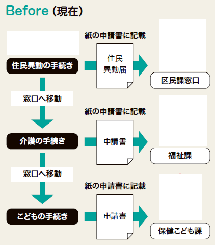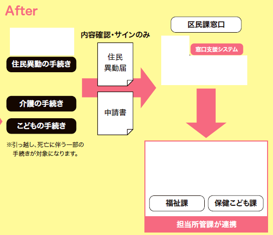 引っ越しなどのライフイベント時に発生する住民異動や国民健康保険などの手続きについて、職員がヒアリングを行い一緒に申請書を作成。住民異動や証明発行は、署名(サイン)だけで受け付けをすることができるようになります。