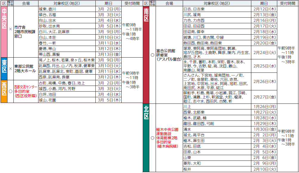 ・上記各区の申告期間は、各申告会場に市民税課職員が出向するため、市民税課・区役所税務室窓口での申告・相談は遠慮ください。上記の各会場で申告・相談をお願いします。