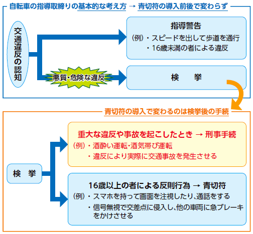 自転車による交通違反の指導取締りの基本的な考え方は変わりませんが、検挙されたときの手続きが変わります。