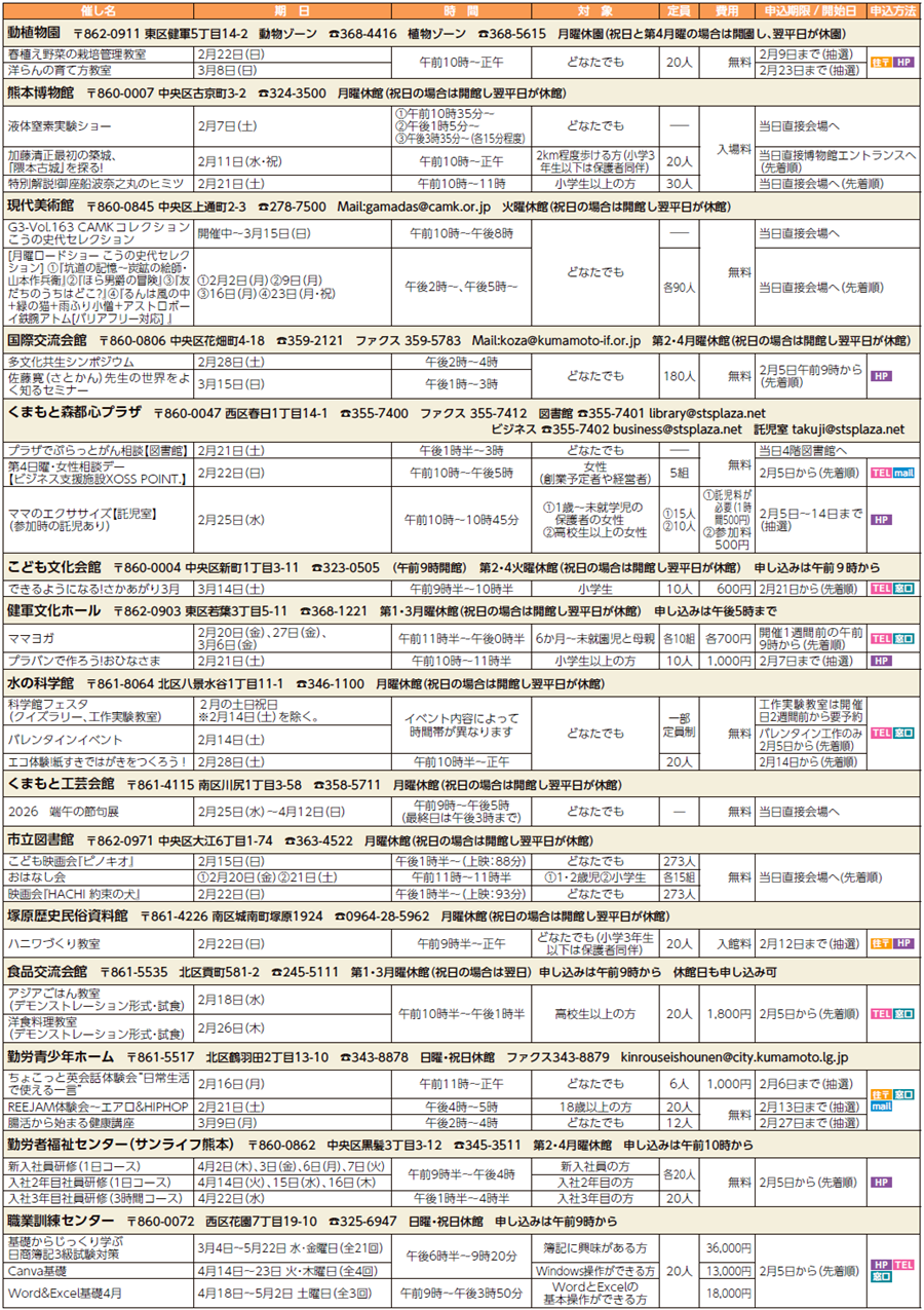掲載しているもの以外にも催しを開催している場合がありますので各施設へお尋ねください。