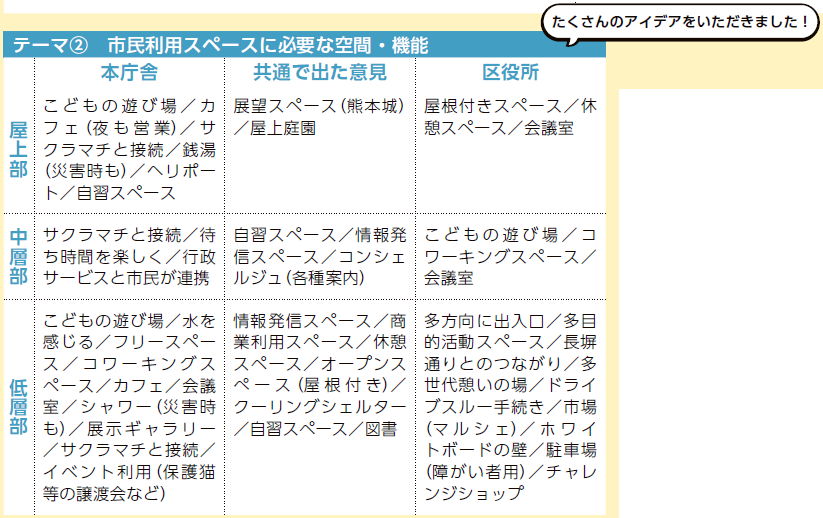 皆が楽しめる憩いの場/夜間も使えるスペース/土・日・祝日も使える/防災に役立つ/ネーミングで親しみやすく/観光の拠点/情報の発信と受信(歴史・文化・地理・まちでの活動)/集い・交流の場/フレキシブルに使える/敷居が低い/熊本に来た人に文化歴史を発信し交流できる/何かしたい人を後押しする(観光・市民活動・企業スタートアップ等)/熊本愛(誇り)シビックプライドを育む場所(むかえ入れる本庁舎)