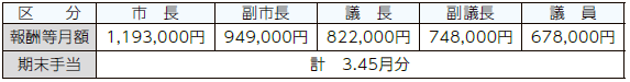 市長、議員の報酬などは、市内の公共的団体の代表者などによる特別職報酬等審議会の答申に基づき、市議会の決定を経て定められています。