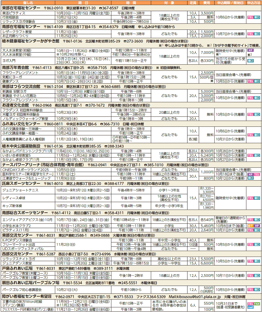 内容が変更となる場合があります。最新情報はホームページまたは各施設へお尋ねください。
