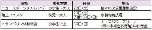 スポーツ スポーツフェスタ秋季大会(11月) 39/50 前の記事 次の記事 発行日 : 2025年10月20日 自治体名 : 熊本県熊本市 広報紙名 : くまもと市政だより 2025年11月号 Vol.931 詳しくは、熊本市文化スポーツ財団ホームページまたはナースパワーアリーナ(熊本市総合体育館・青年会館)(【電話】385-1010)へ。 Tweet シェアする みんなで応援しよう!11月ホームゲーム 施設の催し