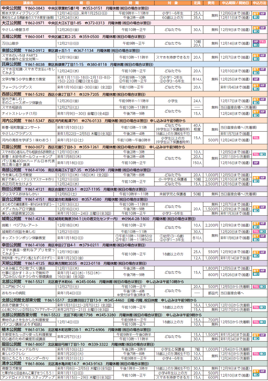 掲載しているもの以外にも講座を開催している場合がありますので各公民館へお尋ねください。