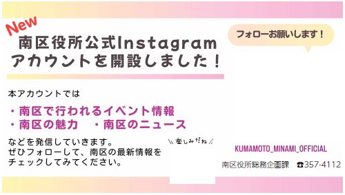 文化 南区ニュース 2/5 前の記事 次の記事 発行日 : 2025年09月20日 自治体名 : 熊本県熊本市南区 広報紙名 : くまもと市政だより 南区版 2025年10月号 Vol.930 Tweet シェアする めぐって、みつけて、魅力発見!『ぶらり南区デジタルスタンプラリー』を今年も開催します! 令和7年度南区地域コミュニティづくり支援補助金(二次募集)