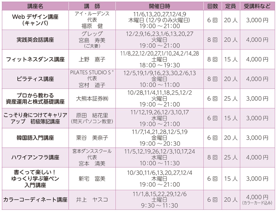 ・受講料は、全回数分です。各講座の初回に納入してください。