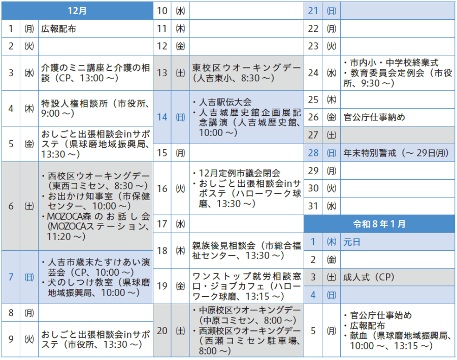 くらし 行事カレンダー 36/42 前の記事 次の記事 発行日 : 2025年12月01日 自治体名 : 熊本県人吉市 広報紙名 : 広報ひとよし 2025年12月号 No.1196 ※CP…カルチャーパレス、SP…スポーツパレス 年末年始のごみ収集日は本紙15ページをご覧ください。 ※変更になることがあります。 Tweet シェアする ひとよしの情報発信 編集後記