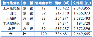 令和6年度の中山間地域等直接支払交付金の実績は、5集落で集落協定が締結され、交付対象面積78万6681平方メートルで交付総額964万9645円です。