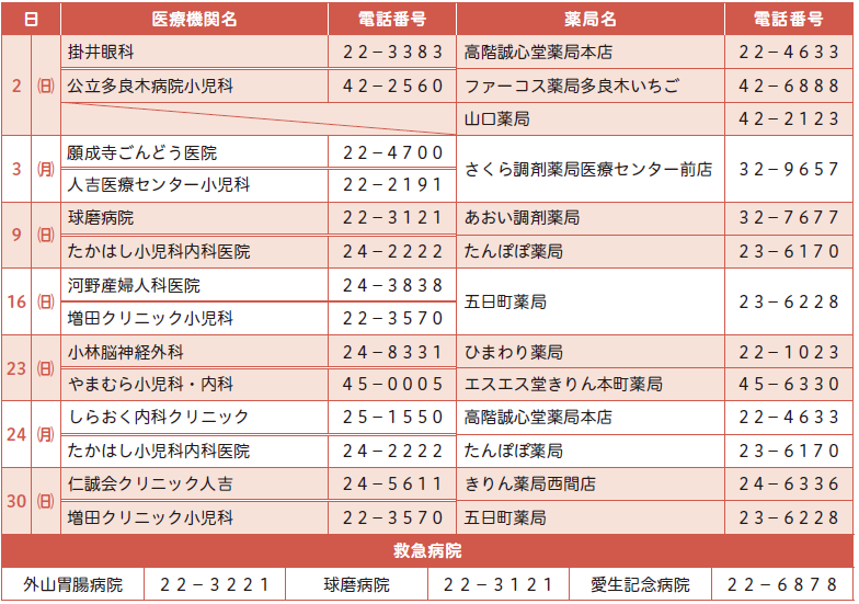 ※変更になることがあります。病院に連絡がつかない場合は、市ホームページをご覧になるか、電話で市役所(【電話】22-2111)にご確認ください。日曜・祝日も対応します。