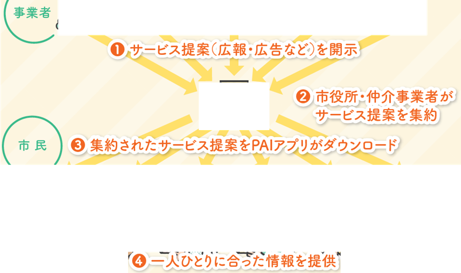 PAIマーケティングでは、市内の多くの事業者が市民に役立つ情報を発信し、その情報からPAIが各市民に適したものを選び、表示します。PAIアプリ「Personary(パーソナリー)」は、本人のパーソナルデータ(年齢・性別・住所・職業・家族構成・健康状態・趣味嗜好などの個人情報を含むデータ)を安全に管理し、そのデータは本人の意思で自由に活用できます。