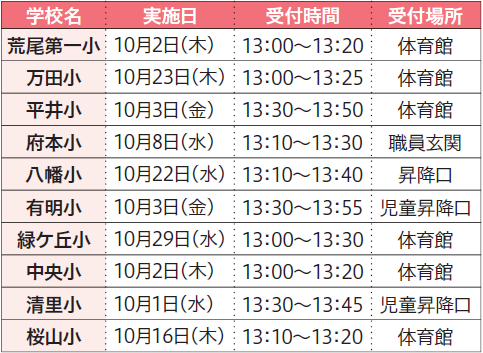 令和8年度に小学校へ入学する子ども(平成31年4月2日~令和2年4月1日生まれ)を対象に就学時健康診断を行います。学校保健安全法に基づいて、入学前の子どもは全員受診する必要があります。右の表を参考に、住んでいる校区で受診してください。