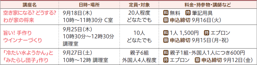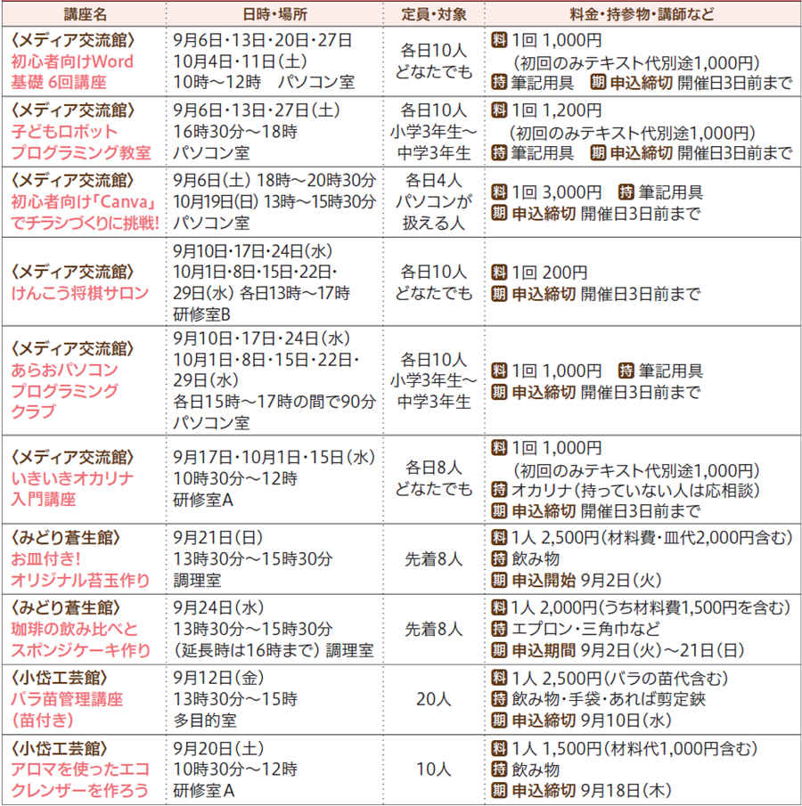 申込み:各施設に電話か来館して申し込み(9時30分~19時30分)