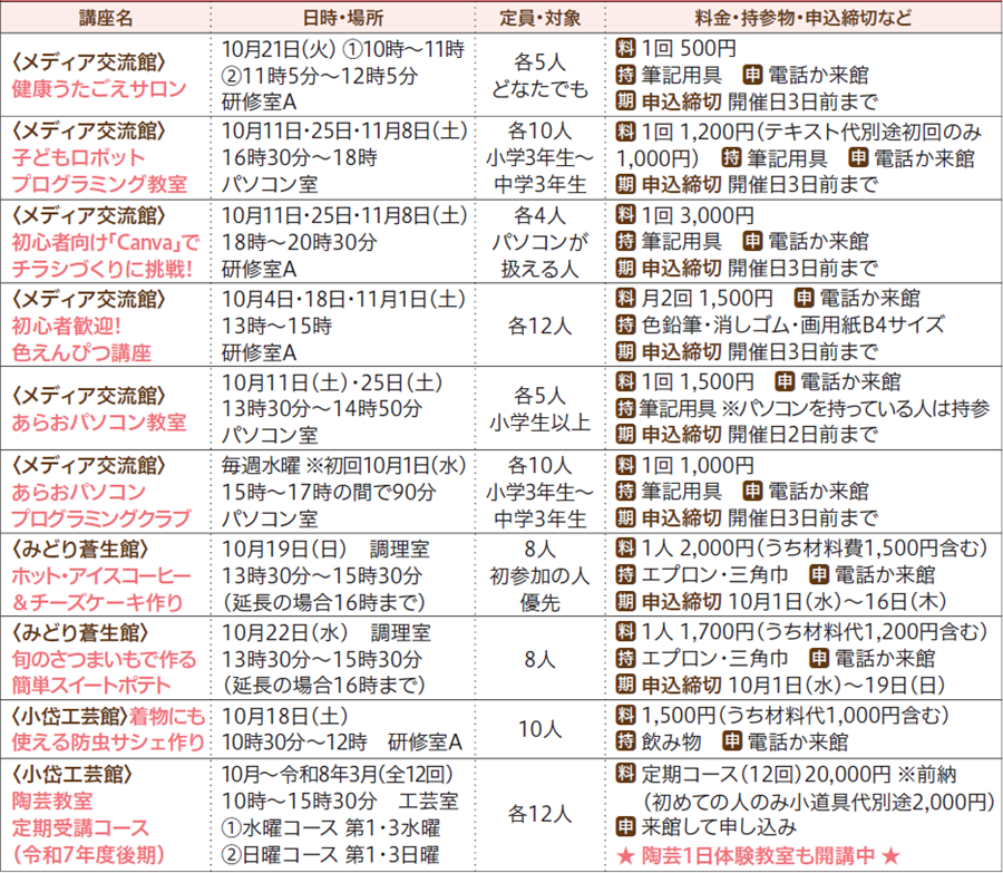 申込み:各施設に申し込み(9時30分~19時30分) ※月曜休館