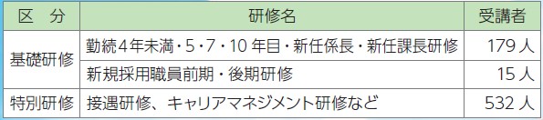 下記研修のほか、高度な専門性や幅広い見識を身に付ける「派遣研修」や学習意欲の高い職員を積極的に支援する「選択研修」を実施しています。