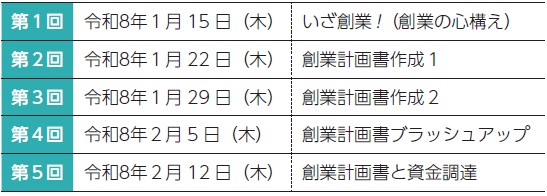 申し込み:令和8年1月9日(金)までに、住所・氏名・連絡先・創業予定業種を問い合わせ先までお知らせください。