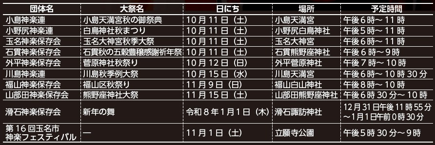 玉名市に伝わる神楽(かぐら)は『肥後神楽』と呼ばれる系統のもので、玉名市の重要無形民俗文化財に指定されています。また、米作りをテーマにした菊池川流域日本遺産の構成文化財の一つにも数えられています。簡素でありながら優美さも併せ持ち、鬼神楽は力強く勇壮です。
