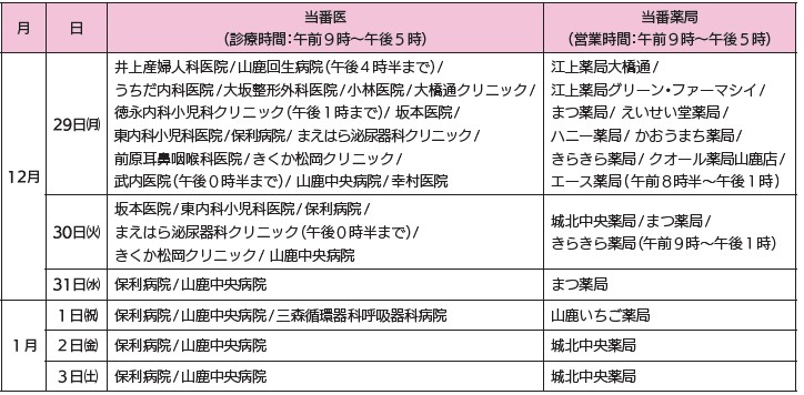 くらし 年末年始の在宅当番医・当番薬局 20/42 前の記事 次の記事 発行日 : 2025年12月01日 自治体名 : 熊本県山鹿市 広報紙名 : 広報やまが 令和7年12月号 *都合で変更になる場合があります。〔鹿本医師会【電話】44-2086〕 *営業時間が異なる薬局がありますので、詳しくはお尋ねください。〔城北中央薬局【電話】43-4394〕 Tweet シェアする カルチャースポーツセンター イベント情報(12月) 年末年始の家庭ごみ収集・自己搬入について